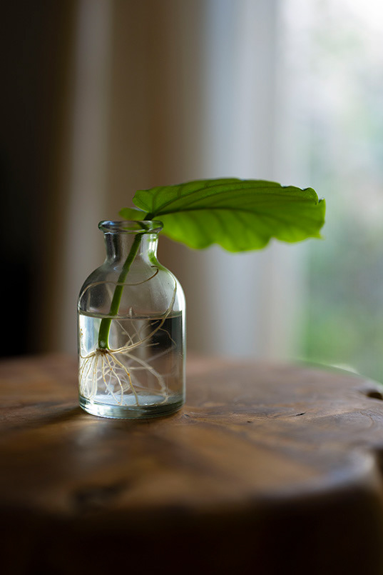 One day, after pruning my Ficus umbellata, I placed a cut leaf in a clear glass bottle filled with water, simply because its shape looked beautiful.